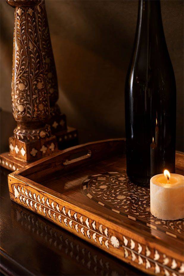 Design: Inspired by the artisanal pieces commissioned by Indian rulers in the 18th century in Rajasthan, this tray is a stunning display of the skillful art of bone inlay in wood with a delicate central motif along with floral vine borders.