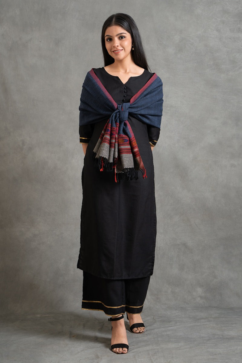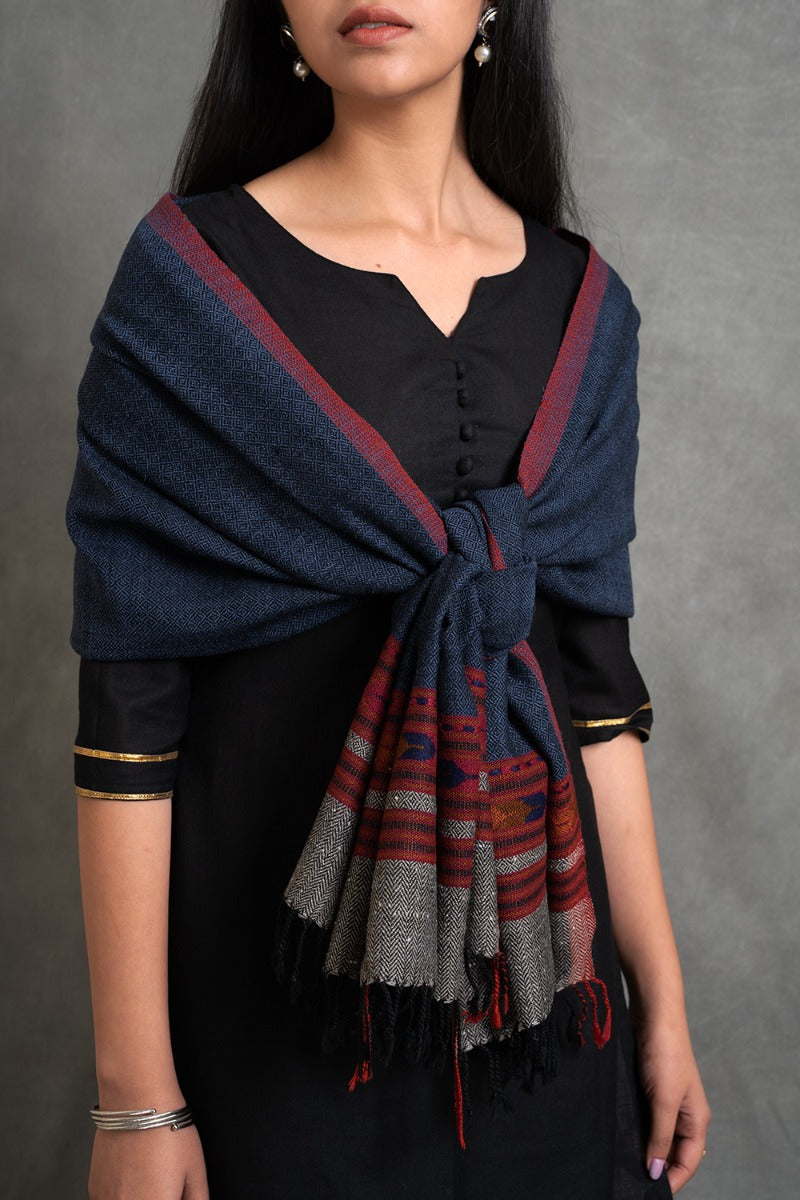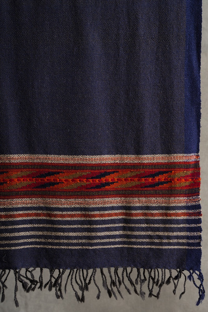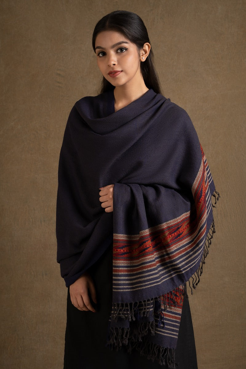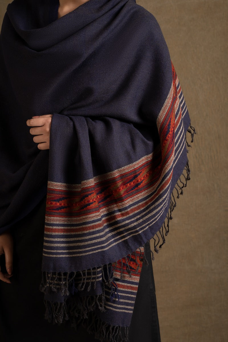 Product Design: Handwoven in an attractive deep blue shade, and featuring multi-coloured stripes that form an attractive and striking border, this warm Kinnauri shawl is just what you need to get your style game on this season!