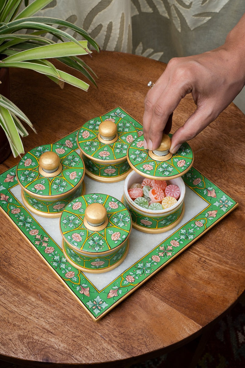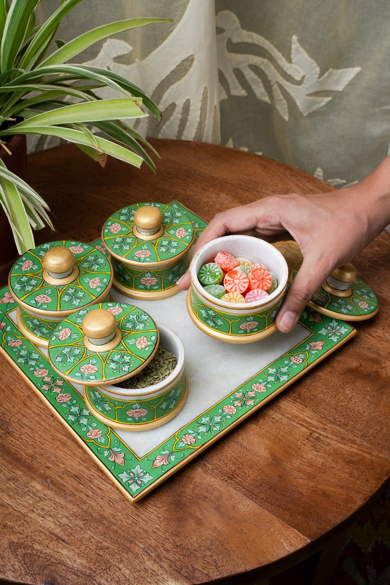 Design: Miniature Mughal style paintings adorn this collection - beautiful hand painted greens accented with gold and hues of pink. This set makes a great gift for any art enthusiast or nature lover.
