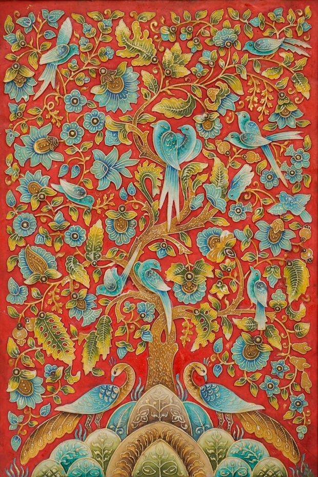 Description: A colour comes in many shades, each holding a specialty of its own. Look into this painting and you'll find fantastic flowers, feathers, birds, and peacocks, all thriving in their individual shade of Sunfire radiance.