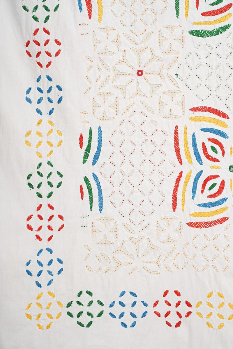 Design: Concentric geometric motifs surrounded by dainty elements of applique work, this bedcover is the perfect combination of comfort and intricate craftsmanship