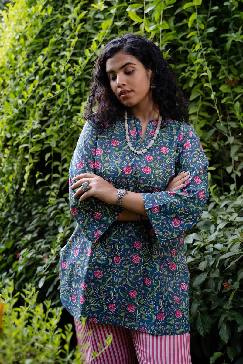 Description: Sleep in utmost comfort in this pure cotton, hand block printed, two-piece nightwear - kurta and pajama. We bet you'd want to lounge around in them all day. What's more? You could try teaming the kurta with cotton shorts to get a casual yet cool look, at home. Alternatively, you can also style the pajamas with a tank top. Throw on a sling bag, and sunnies, and be ready to beat the summer heat!
