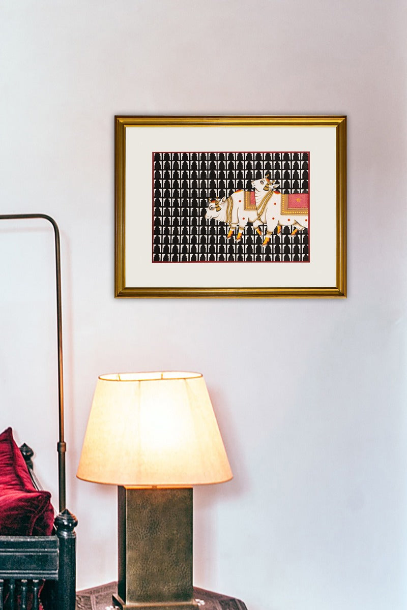 Description: This contemporary style Govardhan painting will add a touch of class to your puja room. It is believed that cows represent fertility, generosity, motherhood, the origins of life, and serenity in Indian culture.