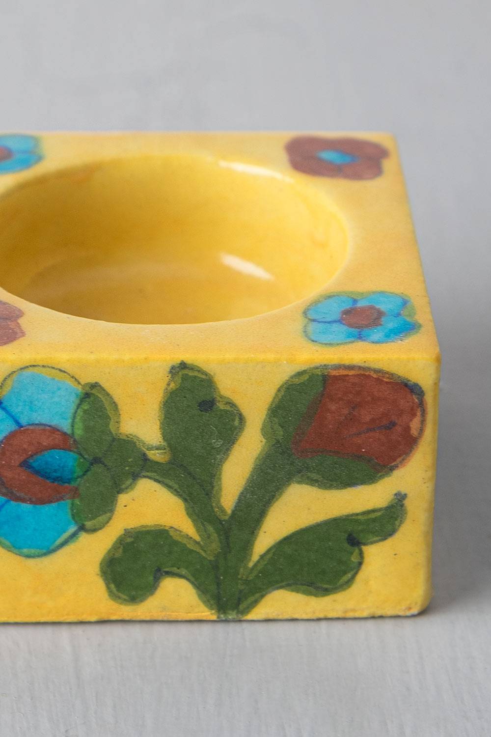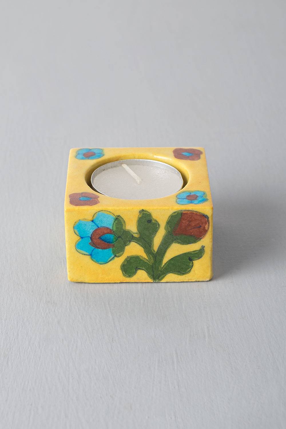 Design: Set against a radiant amber shade, reminiscent of the sunshine in Jaipur, are brightly coloured flowers. All the colours in this set of cube candles come together to form an elegant piece.