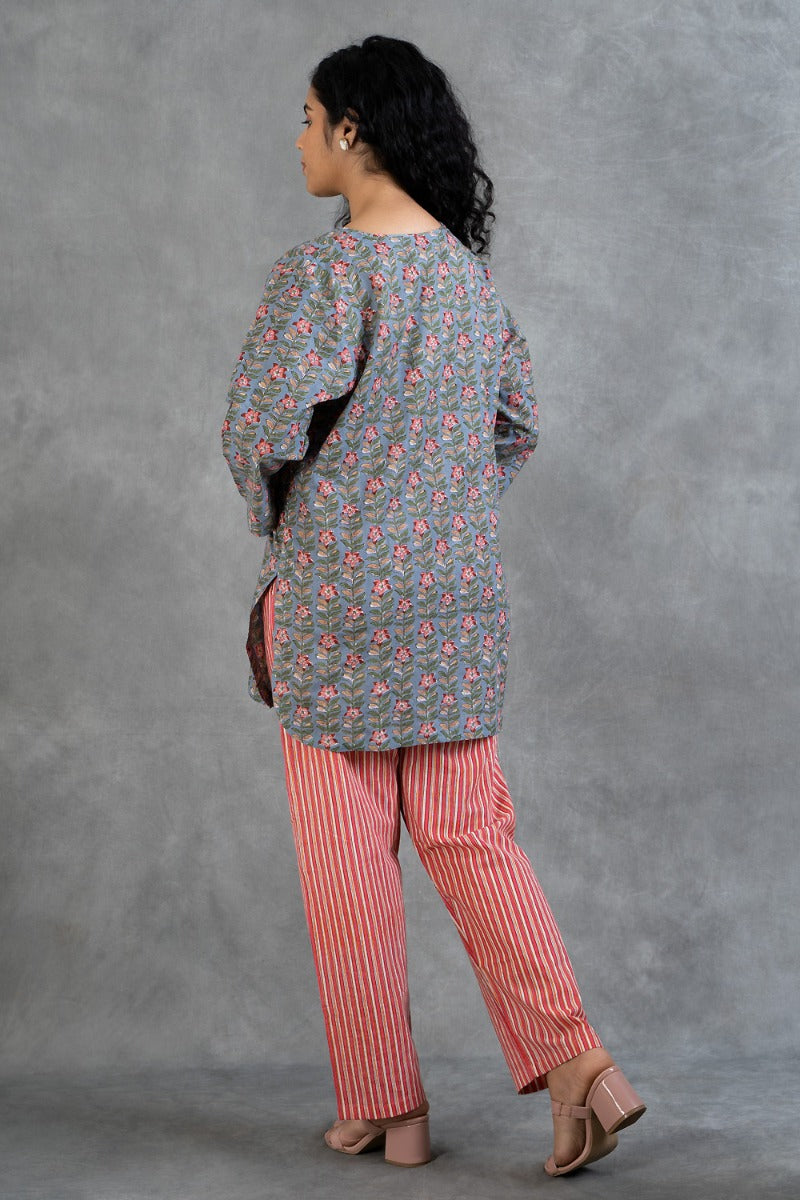 Design: This gray kurta comes with hand block printed, leafy patterns and heavy floral motifs that are in ombre shades of red and pink. The red and white striped pajama follows the vertical pattern on the kurta.