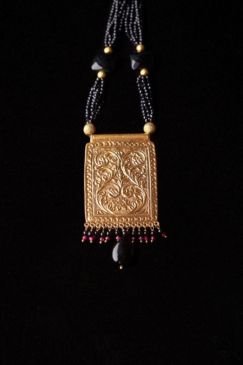 Design:The meticulous pairing of the black chains with the royal motif makes for an ornate set of jewellery.