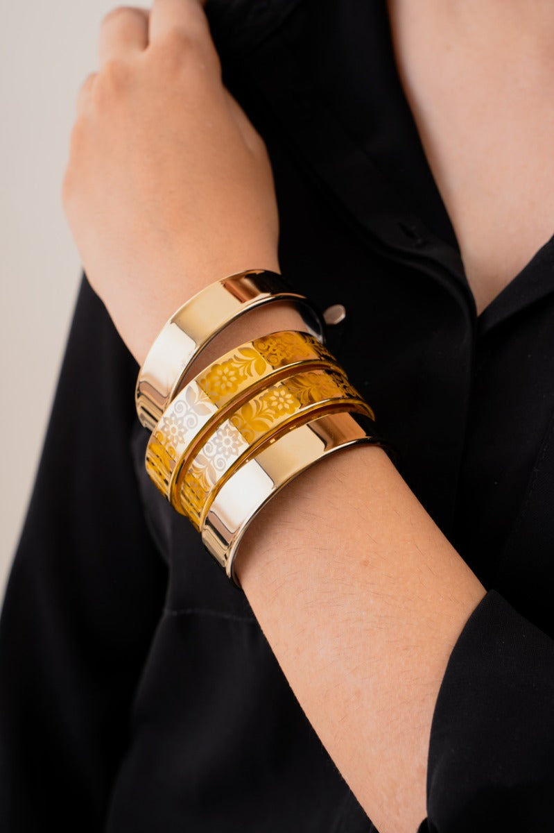 Description: Glass bangles are fashion accessories that are astrologically connected to the planet of luxury and beauty- Venus. The lustrous, shiny and transparent appearance of these golden glass art bangles, make it a hit among women worldwide. Use them as a celebration of womanhood while you ace every milestone in your life!