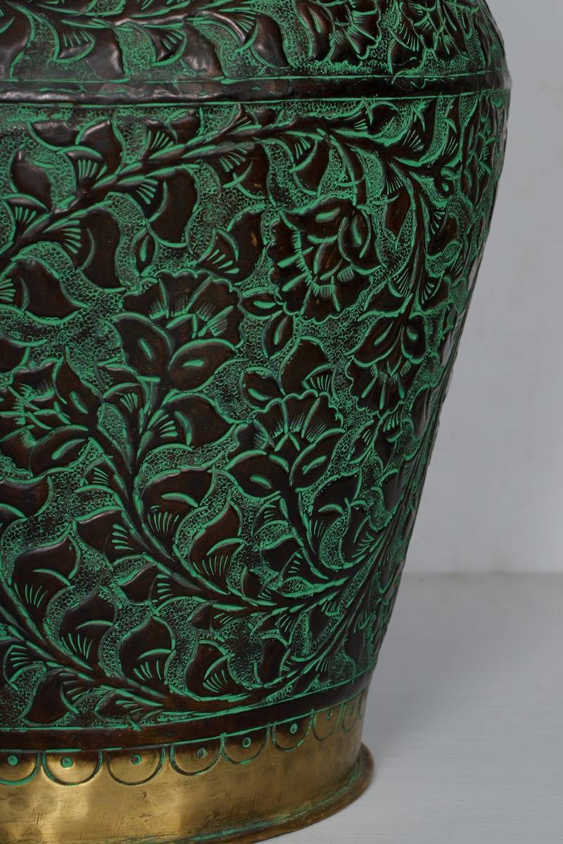 Design: Handcrafted to perfection, this brass lamp features a green patina finish. With its delicate patterns and the dual-toned bottom, our lamp harkens to historical pieces of art, rendering it an ancient look.