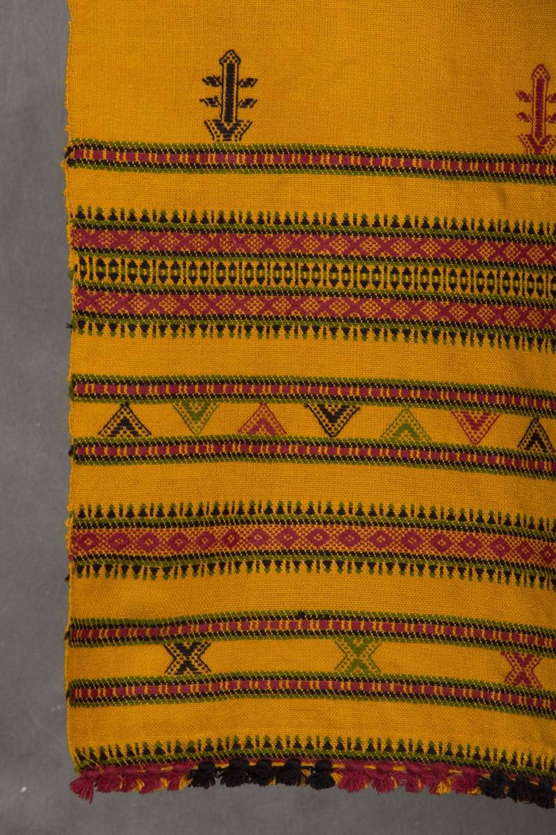 Design: A pleasant shade of mustard adorned with cross and naughts coming together in the form of a traditional dhabla design.