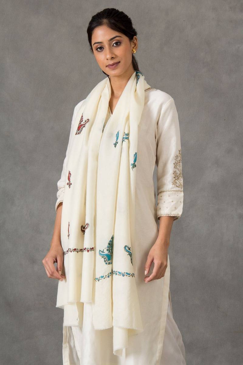 Design:  On a snow-like shade of white you can find some intricately hand-embroidered traditional motifs of Kashmir valley, surrounded by a vine-like border in the vibrant shades of blue and red.