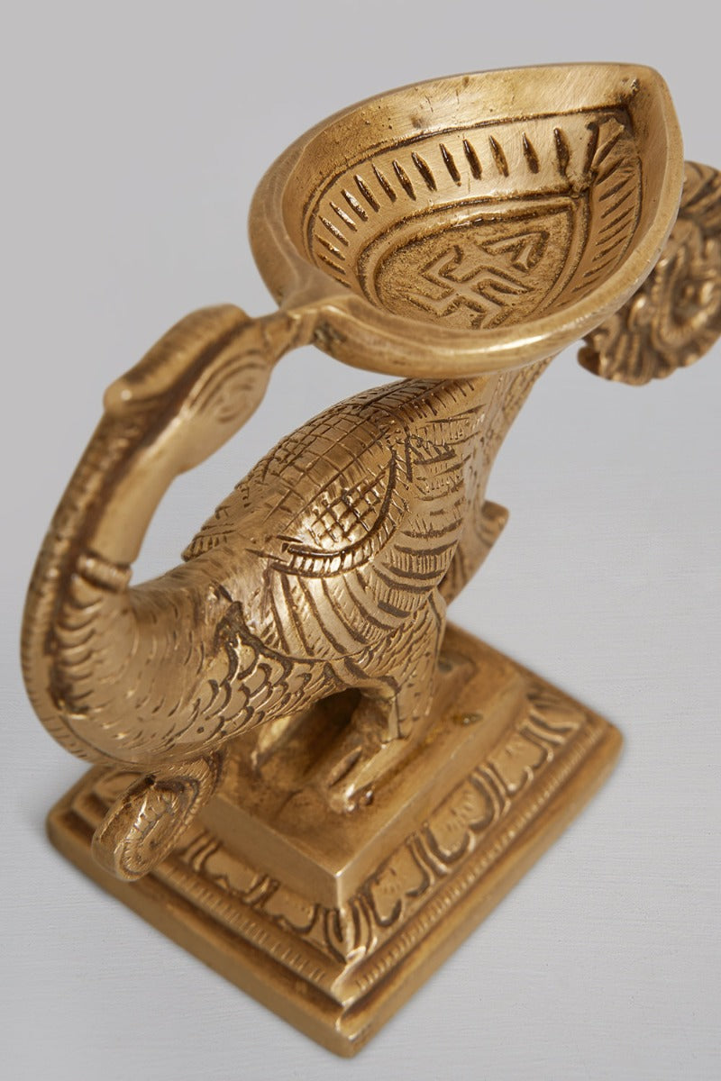 Design: This brass peacock diya flaunts a uniquely designed peahen with its head turned back while its beak holds a pretty diya. The peahen's body is decorated in a fine, intricate way. It stands tall on a layered brass pedestal.