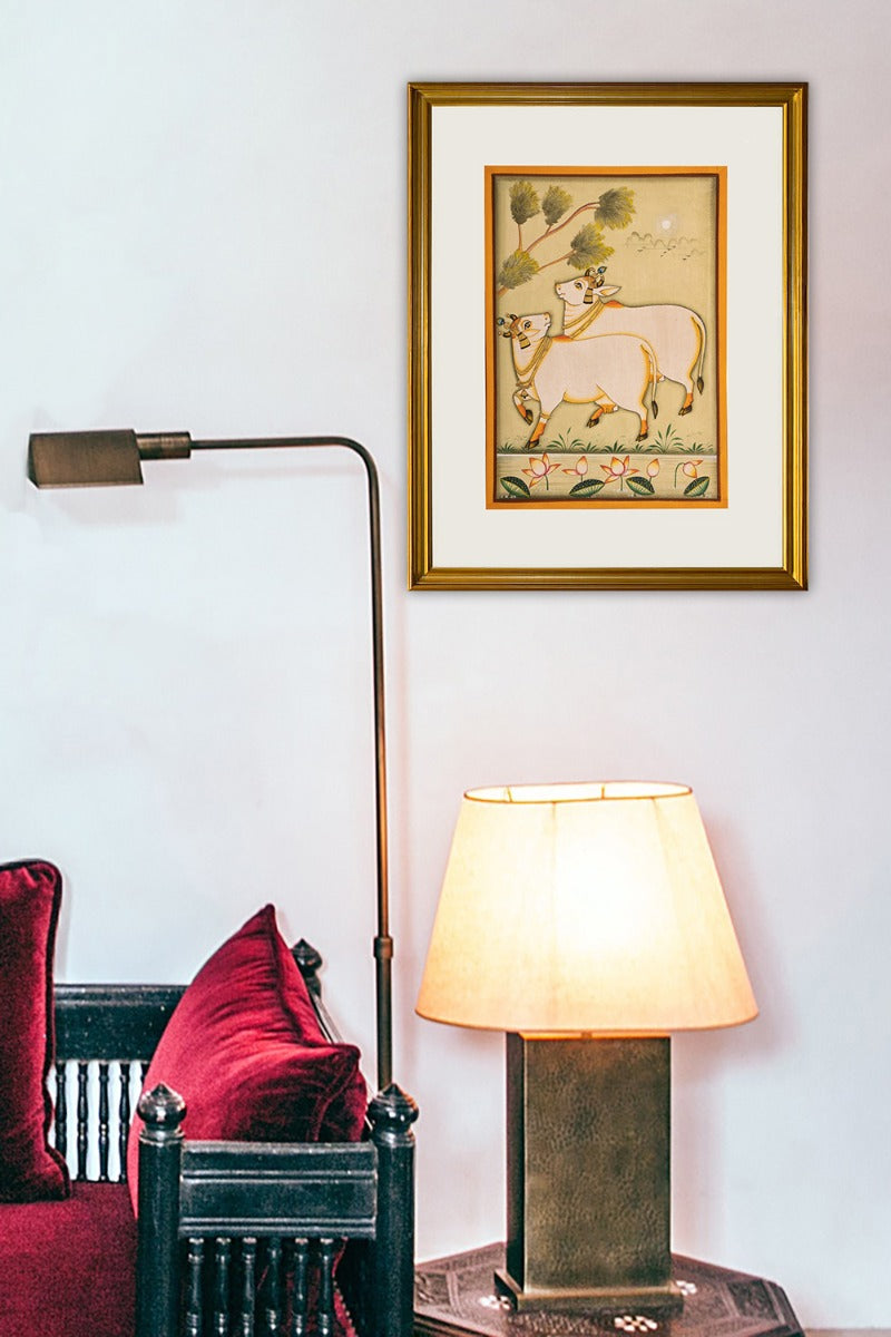 Design: The painting depicts the auspicious cows venturing into the wilderness – a visual straight out of Mathura. Inspired by the popular ‘Pichwai’ paintings, gentle but precise brush strokes have been used to bring this piece to life. The delicate details on the leaves, flowers, and ornaments are significant of the supreme craftsmanship of India’s best artisans.