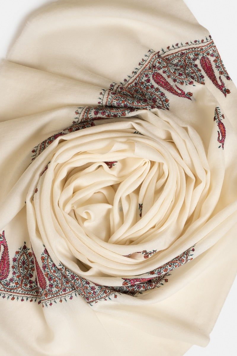 Design: With its minute patterns meticulously embroidered by master artisans onto a woollen canvas, this bespoke Aksi embroidery stole looks like something straight from nature. To be simple yet beautiful, its white base is paired with red and brown tones, floral and paisley motifs. Despite its small, detailed patterns, what really makes the stole stand out is its thick border, which adds a traditional touch.