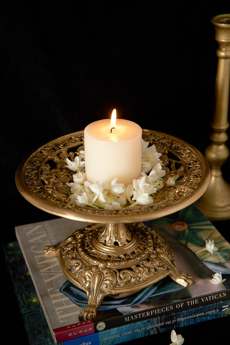 Design: A majestic brass display stand featuring a captivating design inspired by nature and regal motifs.
