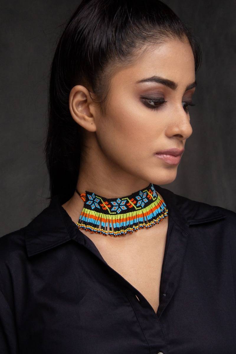 Description: Gujarati beadwork is alternatively known as Moti Bharat Kaam. A product of nimble fingers and heritage designs, this necklace forms a slice of the rich colourful culture of Gujarat.