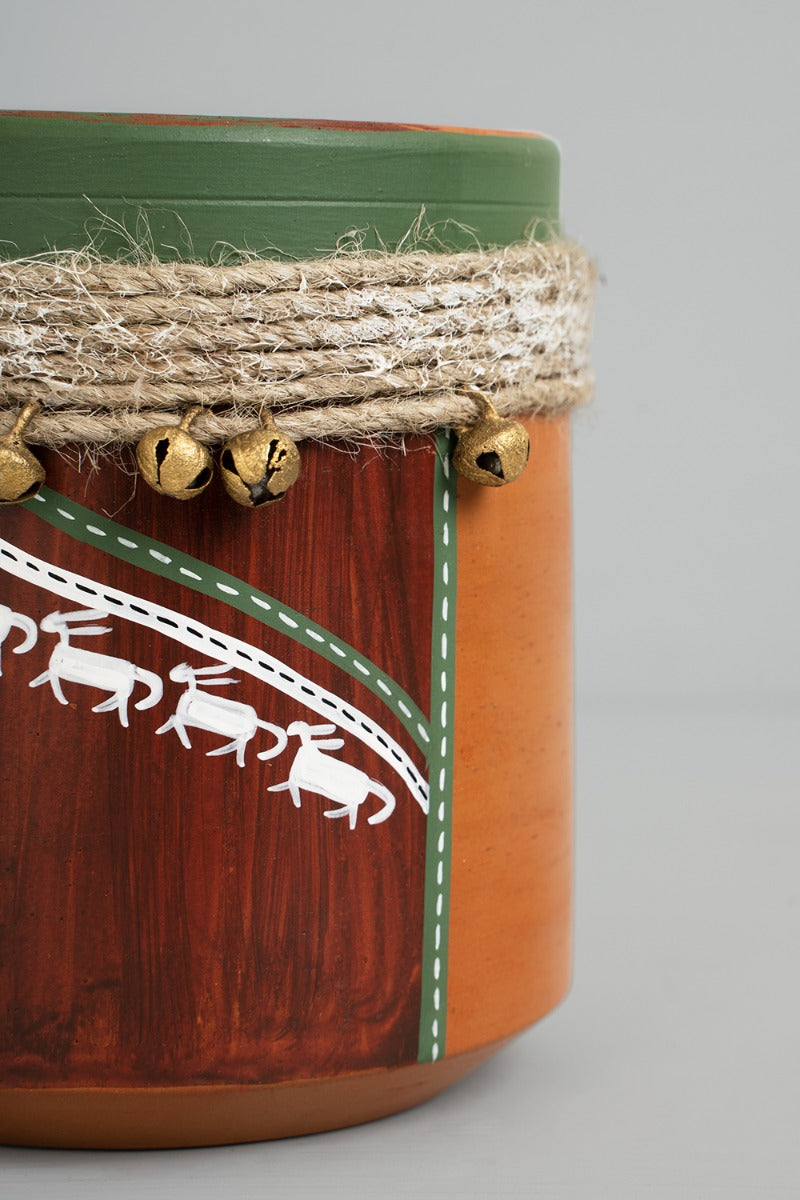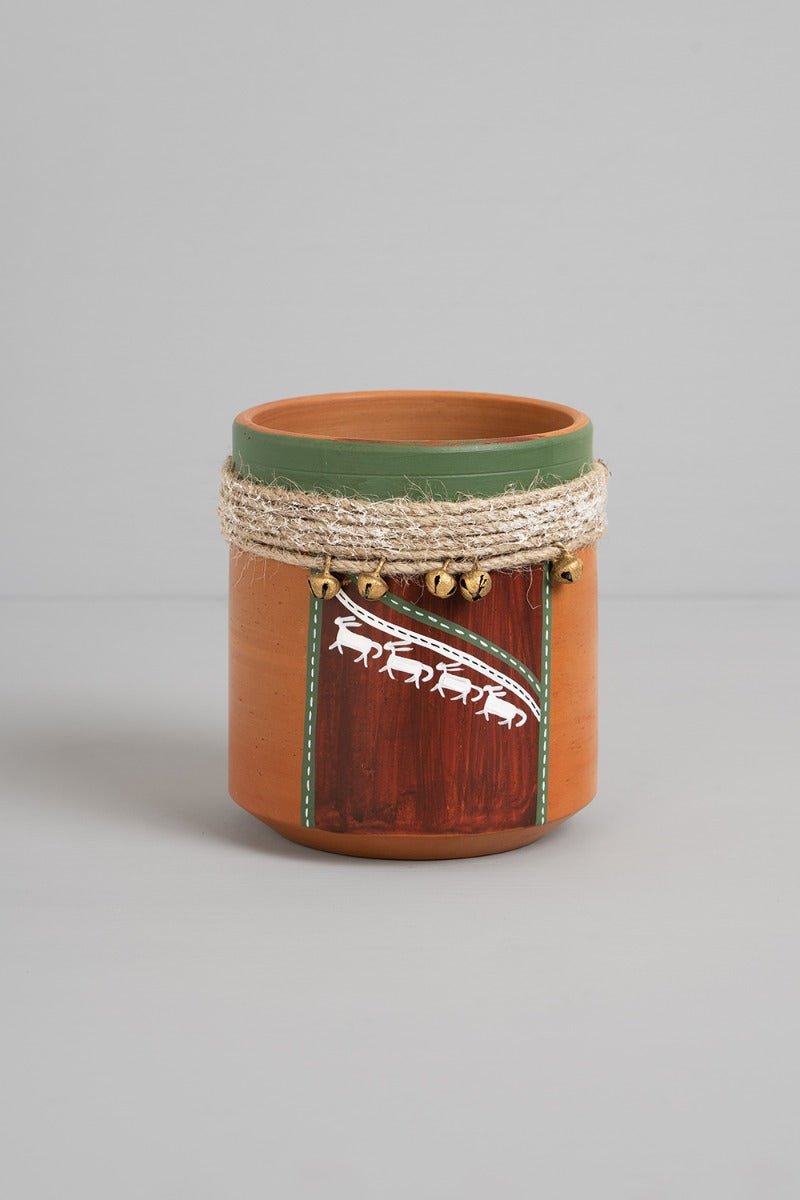 Design: This beautiful hand painted clay planter was crafted by master artisan Suman Sonthalia, who has been awarded the prestigious Shilp Guru for his exquisite workmanship. It features layers of playful, nature-inspired designs. The mini belt of bells on it add to the unique bohemian vibe of the piece.