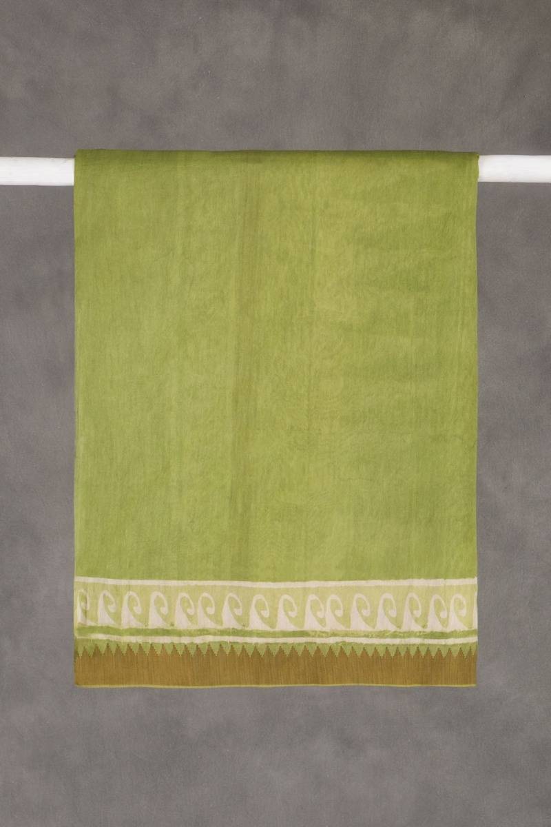 Design:Geometric patterns against the perfect shade of green come together with a golden temple border.