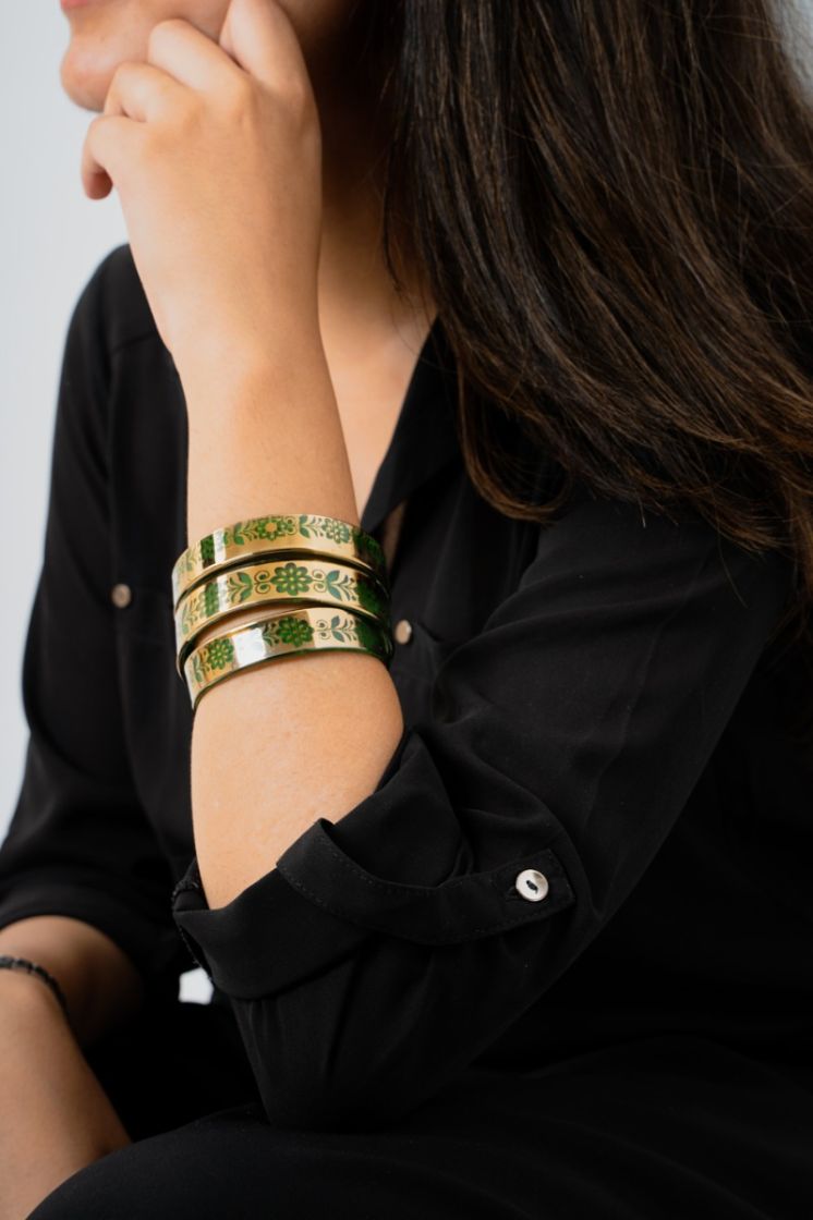 Design: The rich green hue of this glass art bangle is perfectly complemented by the golden-coloured floral motifs on it. Together, they look rich and regal.