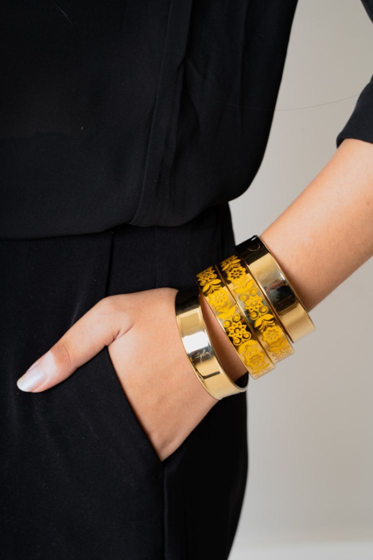 Description: Team up these beautifully elegant golden glass bangles with a saree, salwar or lehenga and be ready to dazzle in its beauty and charm. You can also mix and match it with other golden glass art bangles to get a more elaborate look.
