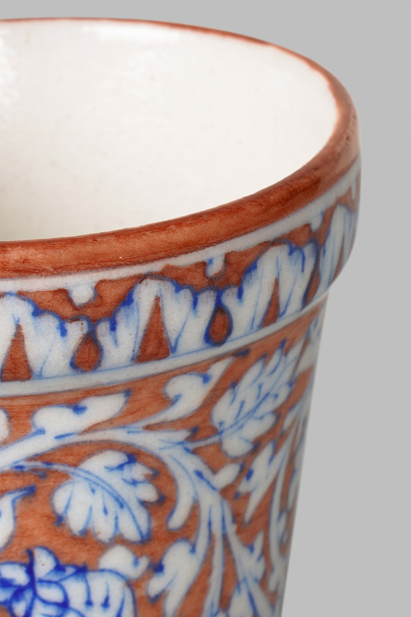 Design: Part of the Iranian tradition of cobalt blue pottery, this clay planter will make for an alluring addition to your home decor. Skillfully hued leaves and petals along with its sleek stature make this vase an artistically precious piece.