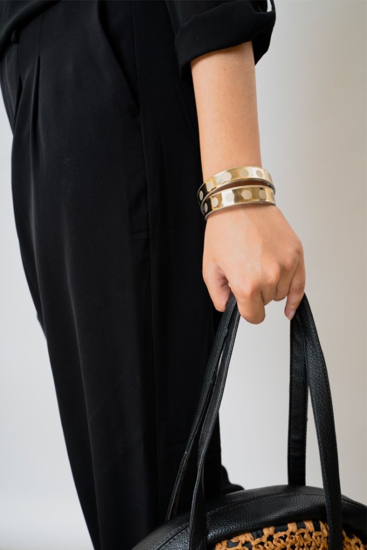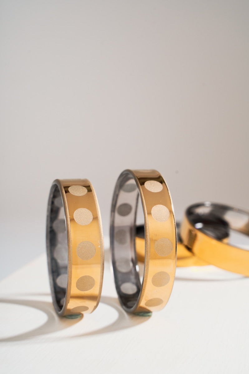 Design: The lustrous glass is beautifully adorned with golden artwork on it. The golden grids formed upon the glass, make it fit for the modern woman. These glass bangles also come with circular designs on golden backgrounds, to give a more sophisticated look.
