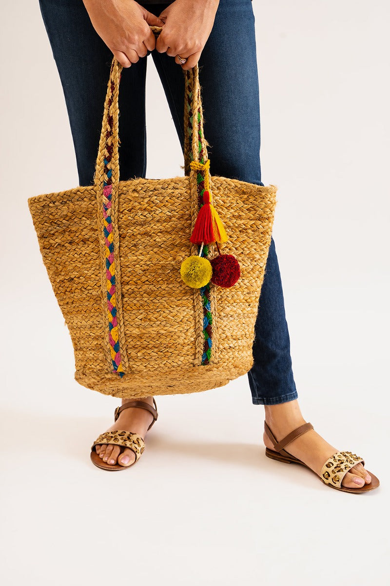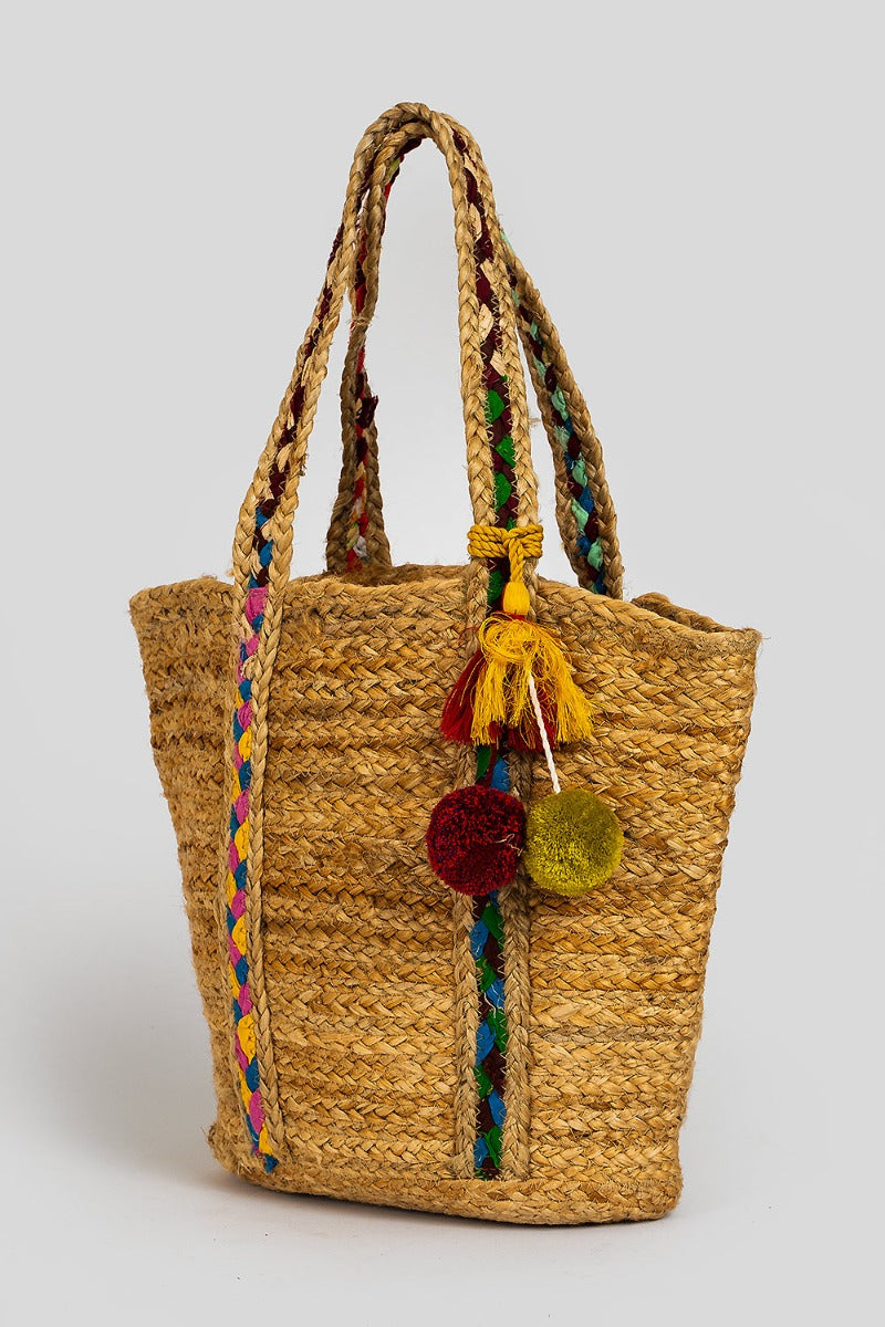 Design: This colored blocked, dual-tone bag is a fine example of the popular jute craft. Featuring the perfect shades of summer, its design allows ample room to carry all your important stuff around
