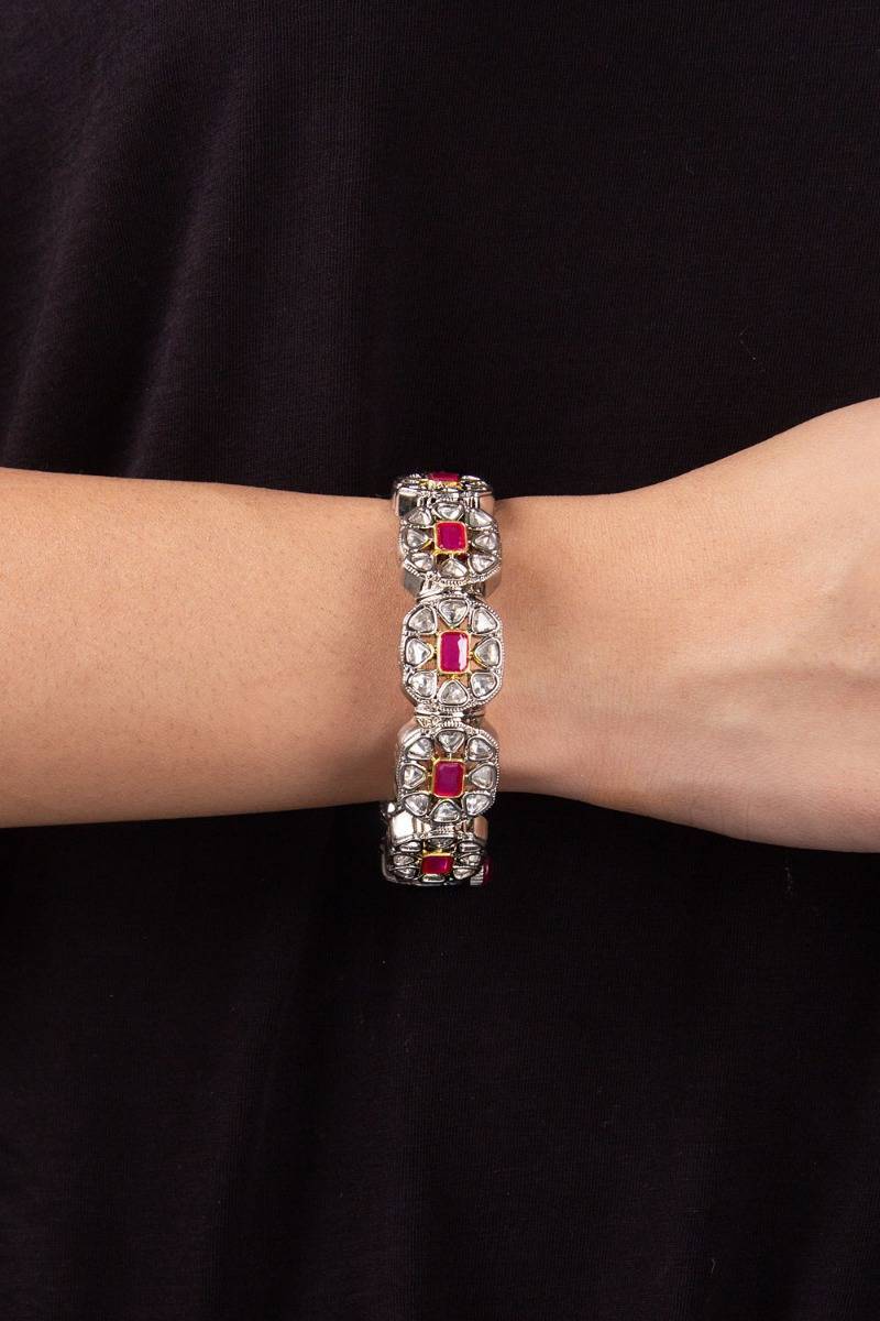 Description: Stunningly embellished with ruby-coluored hydro stone, this bangle speaks of royalty in itself.