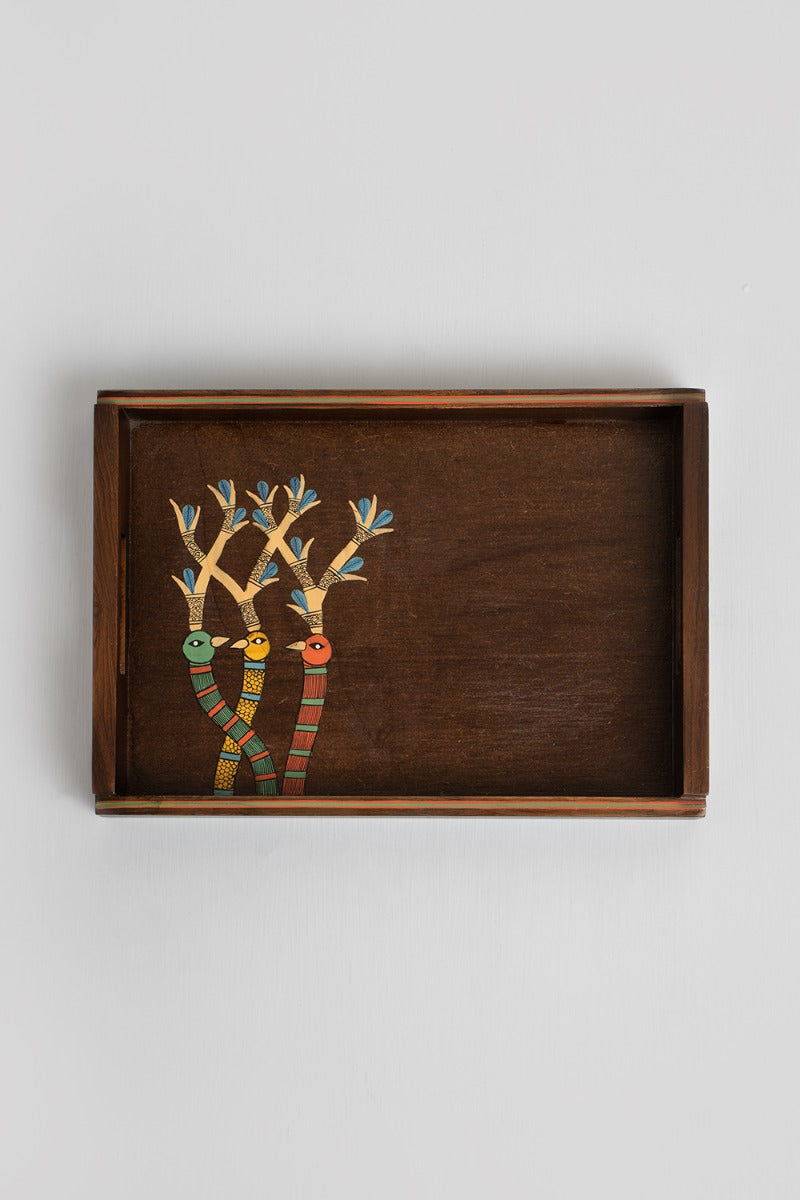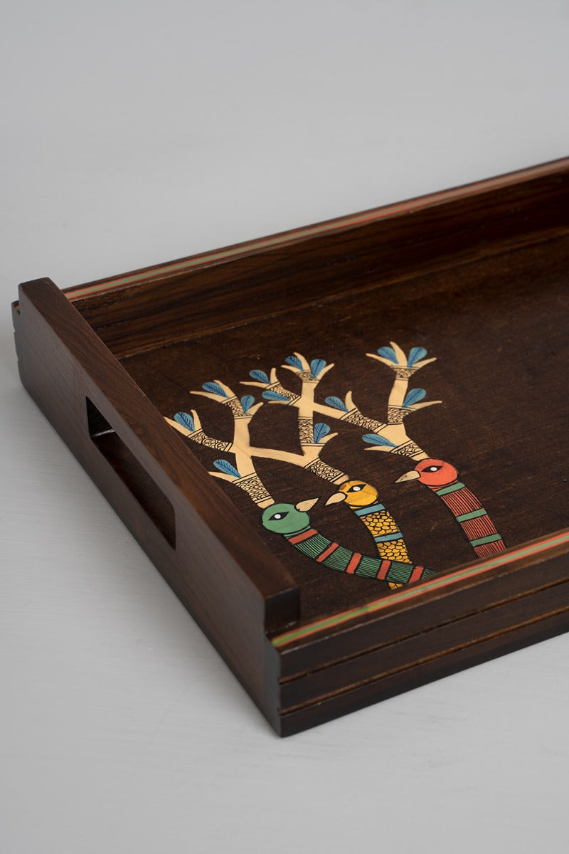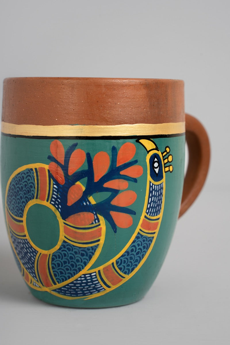 Design: This beautiful hand painted tray (wood) and mug set (clay) is significant of exquisite Indian workmanship. Bright hues of blue, orange, green, and natural wood gives it undeniable allure. The set features nature-inspired designs etched in a style that gives it traditional appeal.