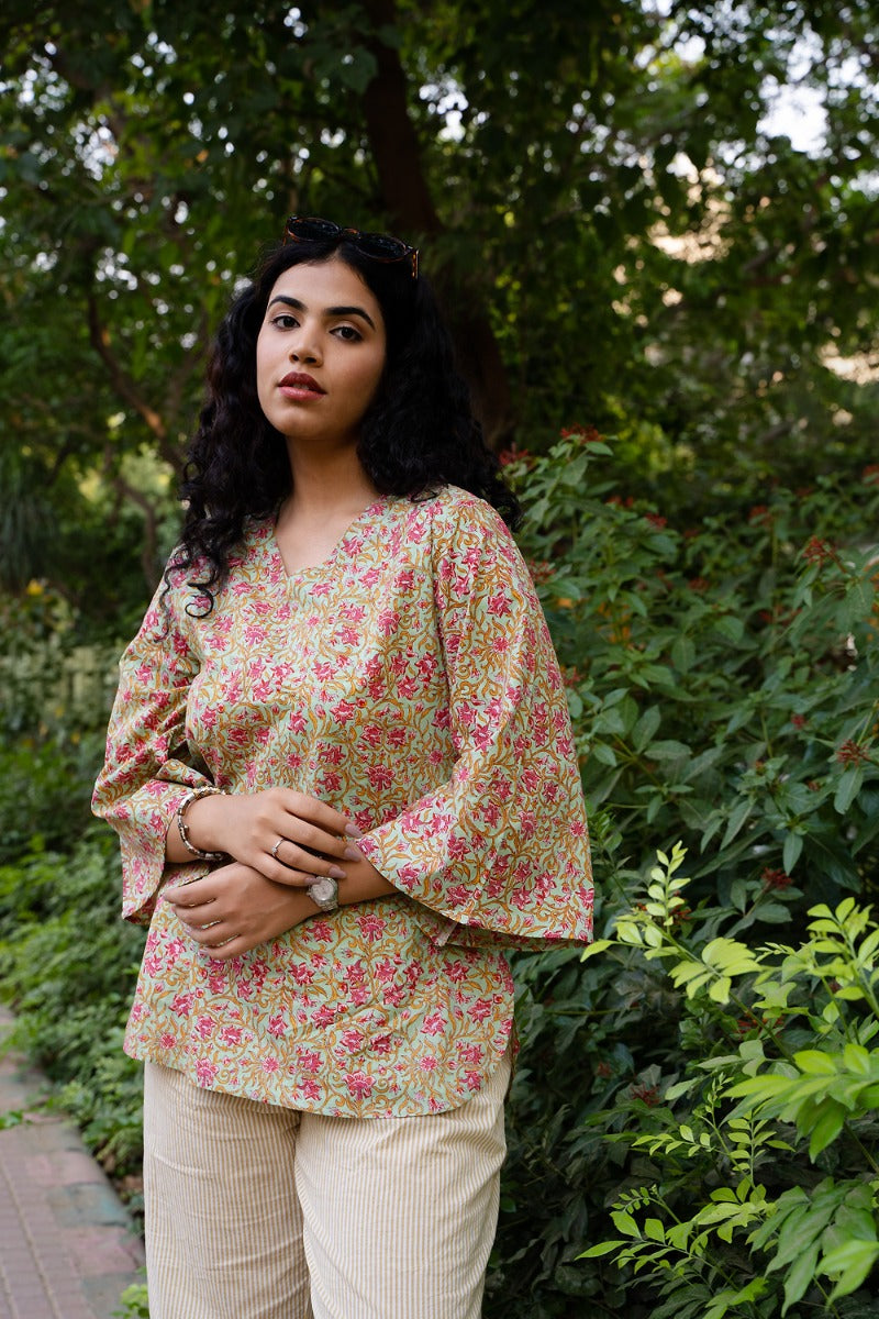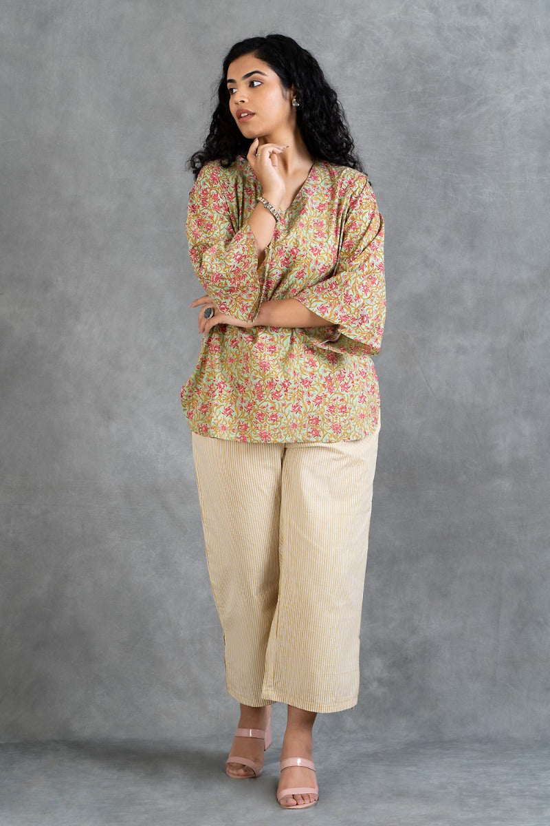 Description: Beat the summer heat with this cool and comfortable, pure cotton, hand block printed loungewear. This V-necked round kurta and capri set will make you fall in love with its soft feel and dainty prints. You can also wear the kurta with any other jeans and the pajama with light or deep-shaded long kurta to get a completely different look.