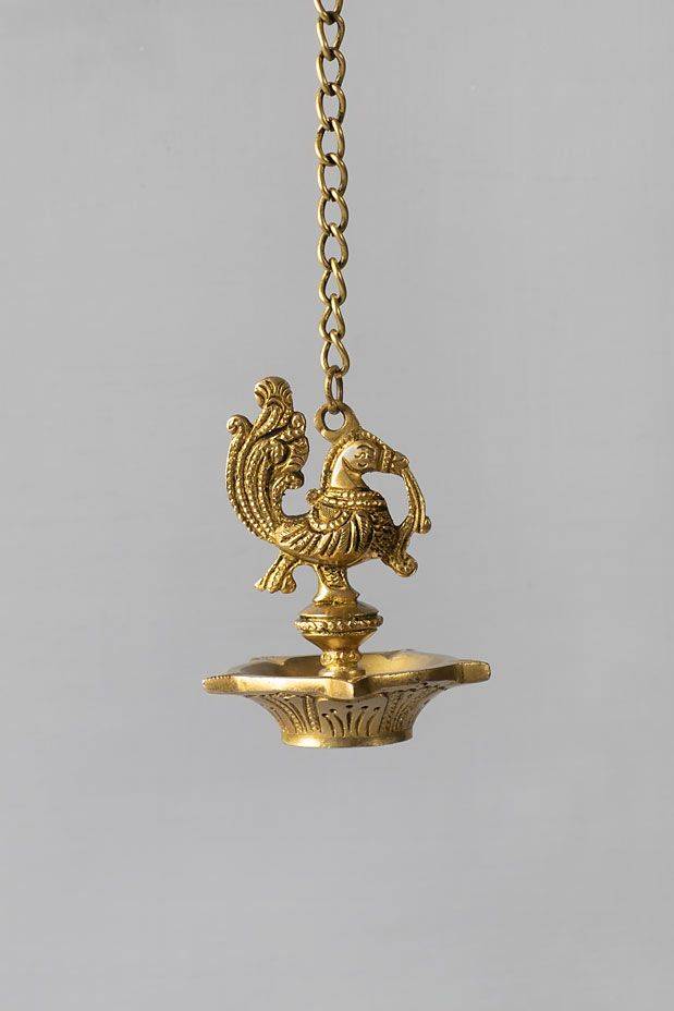 Design: Delicately carved with chisels and skilled hands, this diya is ornamented with a stunning peacock with alluring feathers. Suited for five wicks, this diya also has an elegant chain to make dangle effortlessly.